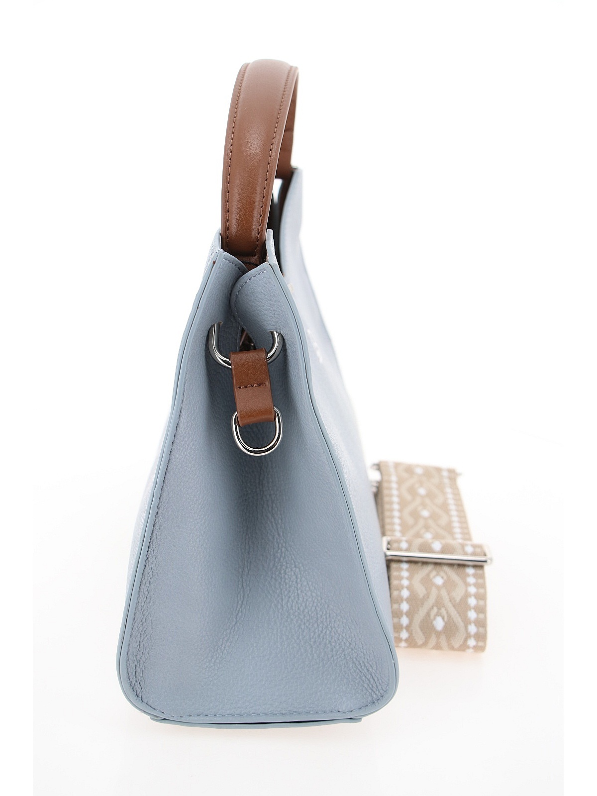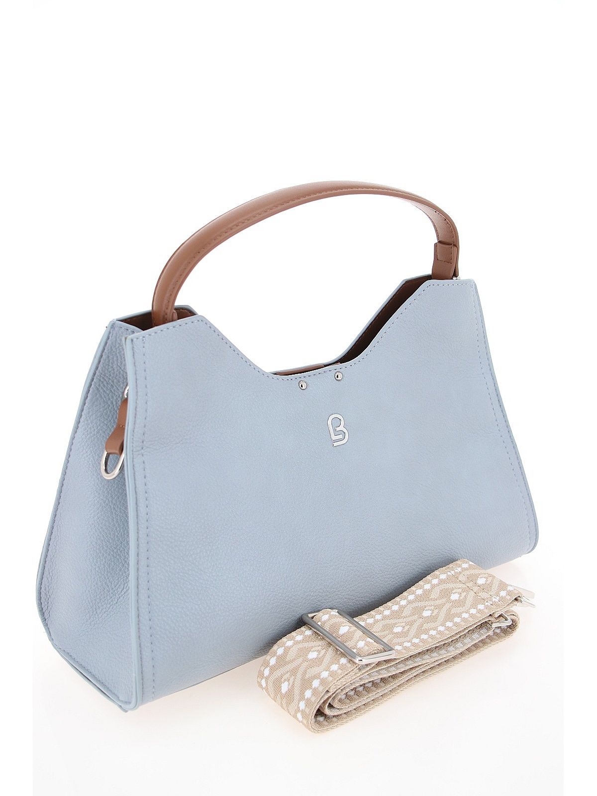 Элегантная женская сумка BADEN нежного голубого оттенка — универсальный аксессуар для повседневного и делового гардероба. Модель из гладкой искусственной кожи имеет трапециевидную форму с жестким каркасом, который хорошо держит силуэт. Боковые панели слегка утоплены внутрь, создавая аккуратный объем. На лицевой стороне расположен лаконичный тисненый логотип бренда. Короткая полукруглая ручка контрастного коричневого цвета позволяет носить сумку в руке или на локте, а широкий текстильный ремень с геометрическим орнаментом добавляет универсальности для ношения на плече или через плечо. Эта модель станет стильным дополнением ваших прогулок и повседневных образов. оптом в Нижнем Новгороде